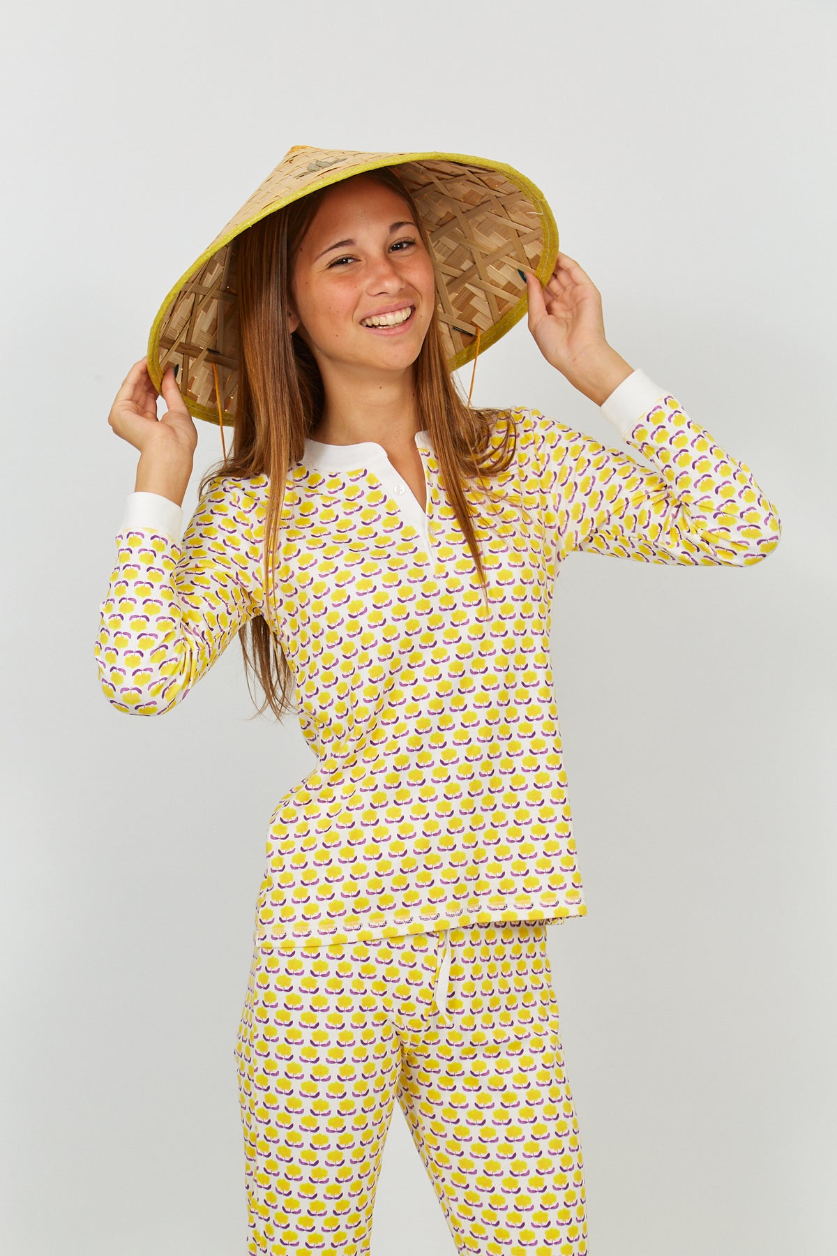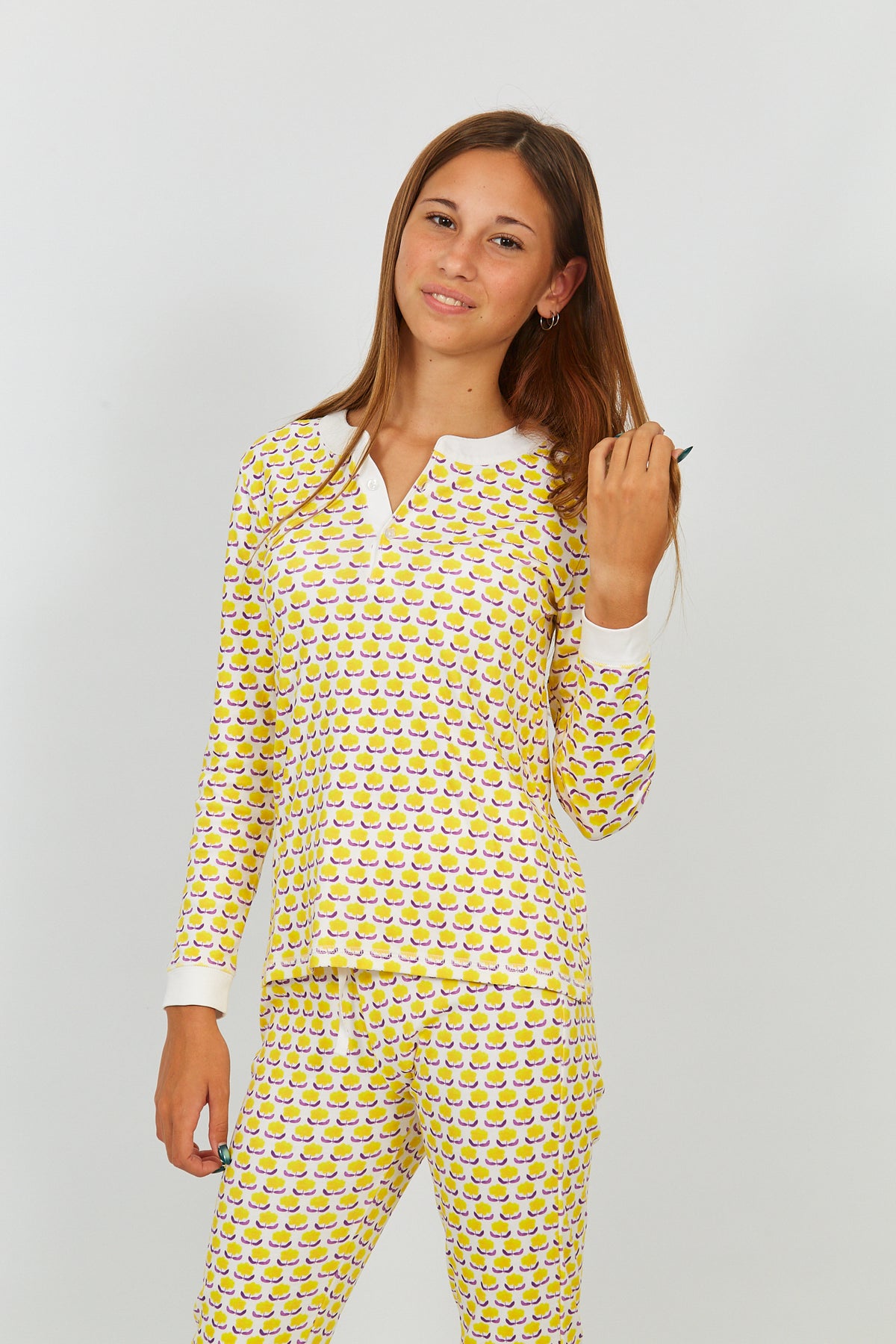 The Pippa pajama set includes a matching top and drawstring-waist bottom in ultra-soft pima cotton. 100% pima cotton.